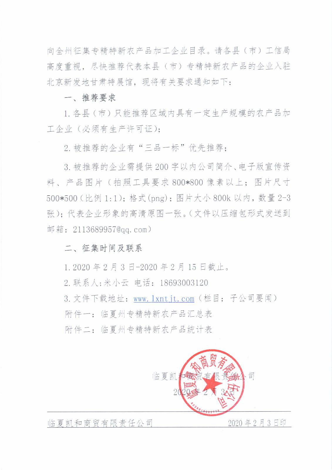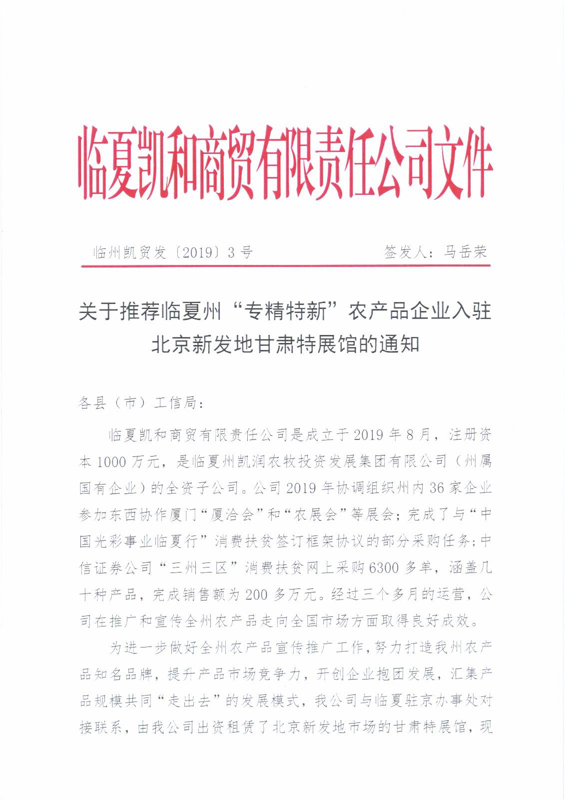 关于推荐临夏州“专精特新”农产品企业入驻北京新发地甘肃特展馆的通知.pdf